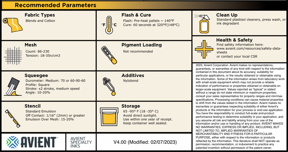Mercury Low Bleed White PLHE1050 is designed for maximum smoothness and opacity on cotton (pre-test for potential to ghost) and poly/cotton fabrics. Mercury LB White has excellent to superior matting characteristics and a creamy consistency with low tack on cotton/poly blends and tri-blends. PLHE1050 is fast flashing allowing for shorter dwell times and faster production rates. Its opacity coverage and bleed resistance are all good to great. Mercury's boutique finish is capable of extremely high detail making it the best choice for printing spongey or super soft blends that fibrillate easily